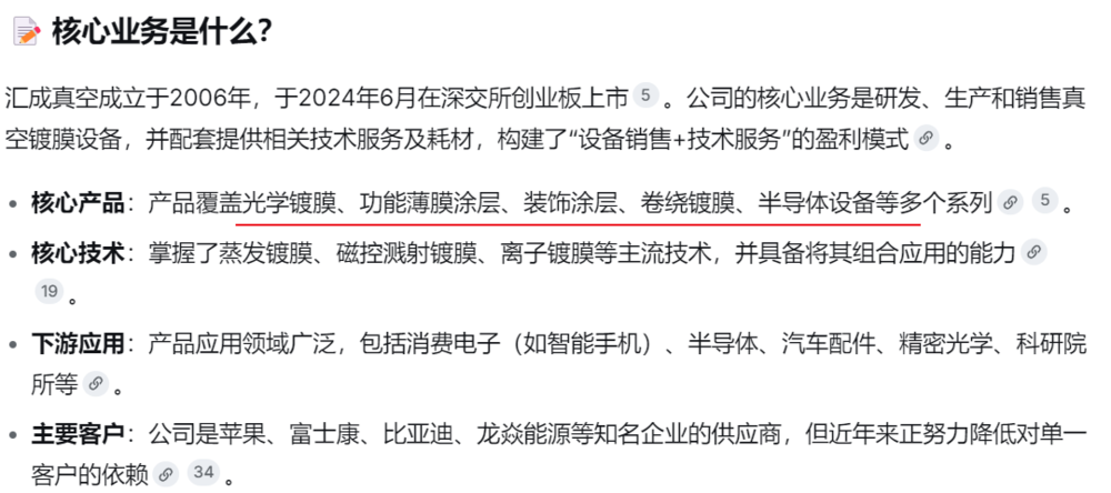 汇成真空诞生于2006年,于2024年6月在深交所创业板上市。公司的中枢业务是研发、坐褥和销售真空镀膜开拓,并配套提供有关本领事迹及耗材,构建了“开拓销售+本领事迹”的盈利方式。