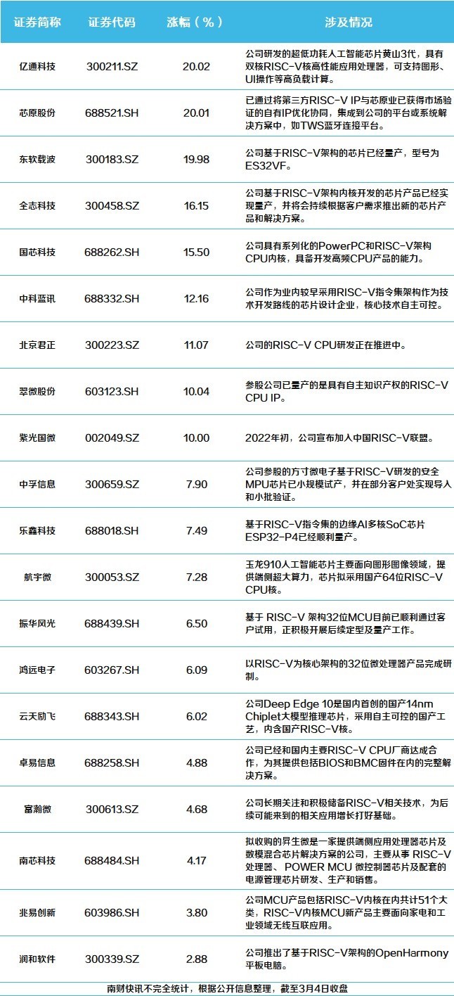3月4日,RISC-V芯片宗旨股午后集体拉升,亿通科技(300211.SZ)、芯原股份(688521.SH)20CM涨停,全志科技(300458.SZ)、国芯科技(688262.SH)、中科蓝讯(688332.SH)等多股涨超10%。